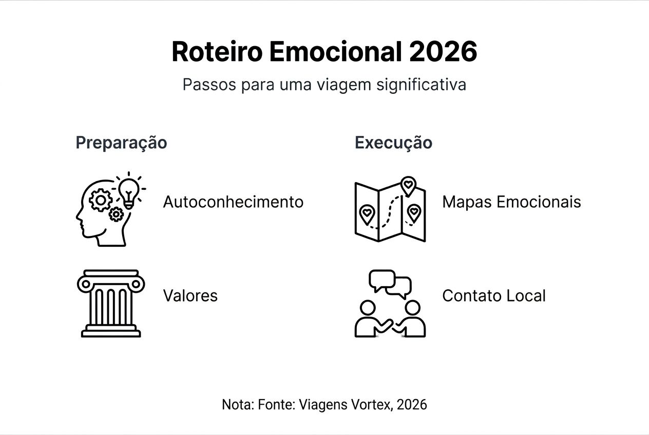 Um roteiro de viagem emocional é um planeamento que prioriza experiências transformadoras alinhadas com os valores pessoais do viajante. Vai além de listar atrações turísticas, integrando momentos de reflexão, contacto cultural genuíno e atividades que promovem crescimento pessoal. Este tipo de roteiro usa princípios de storytelling para criar uma narrativa coerente onde você é o protagonista da jornada.